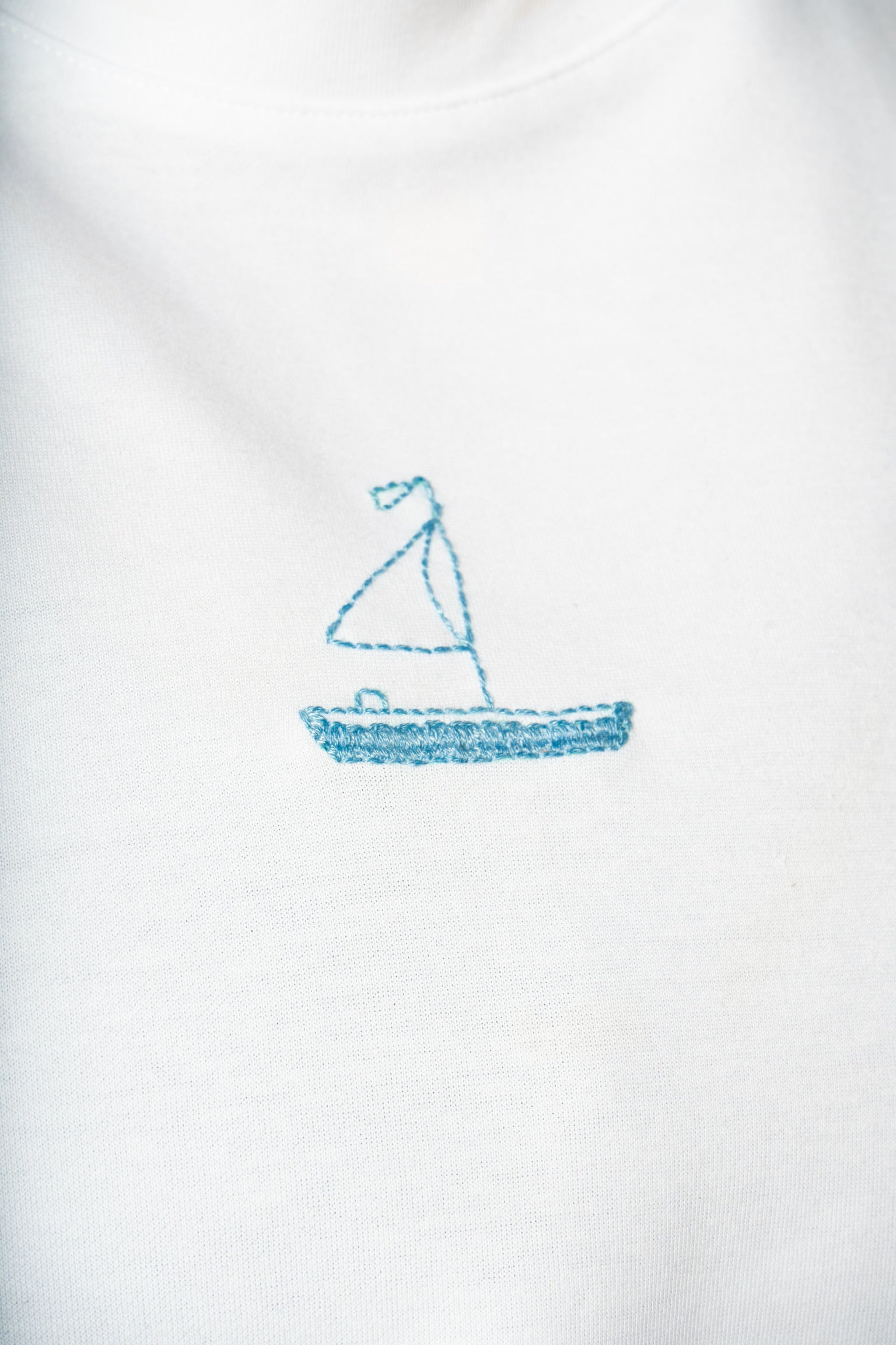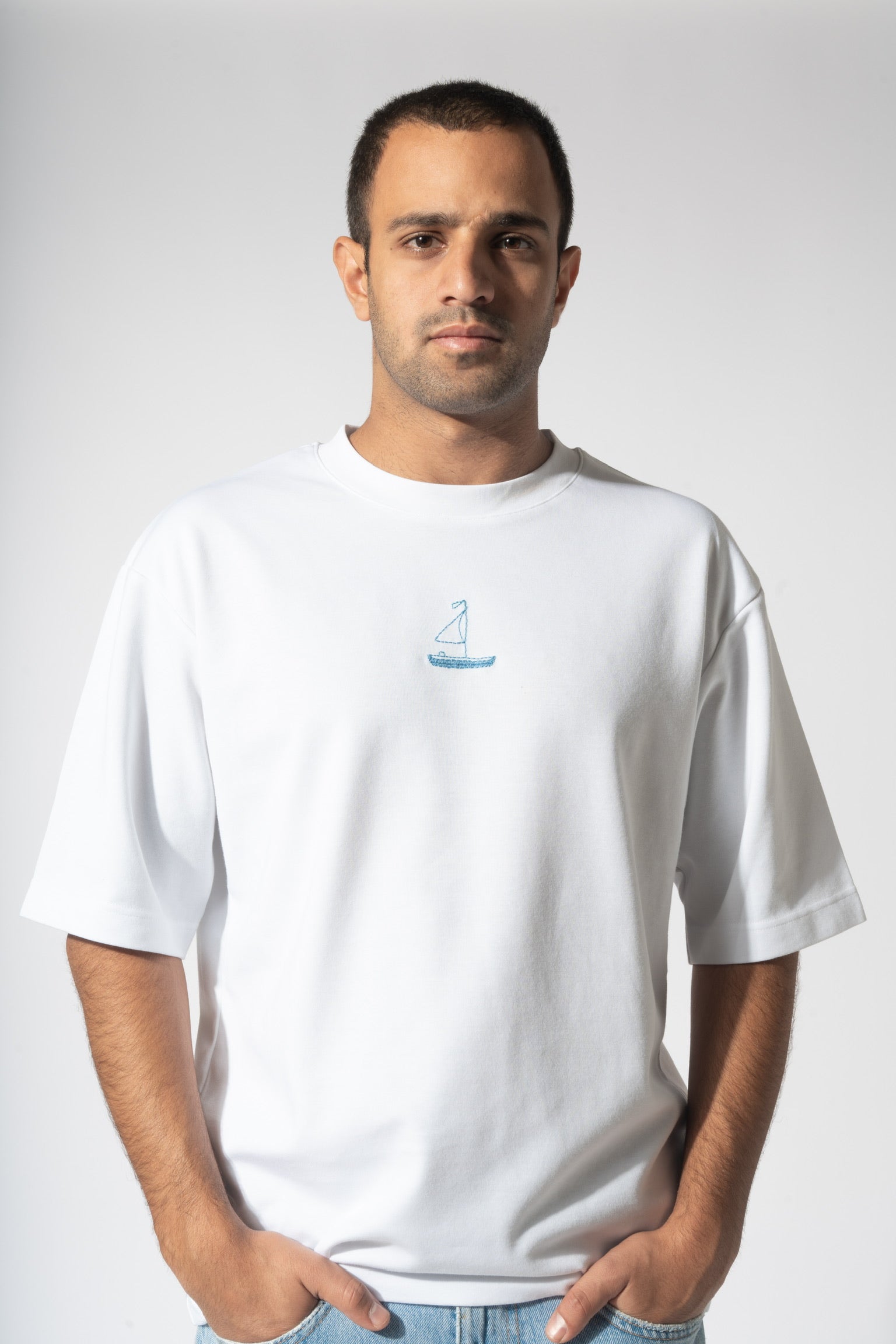 A hand-embroidered sailing boat rests on the oversized white tee. A refined essential for dreamers and voyagers alike.
